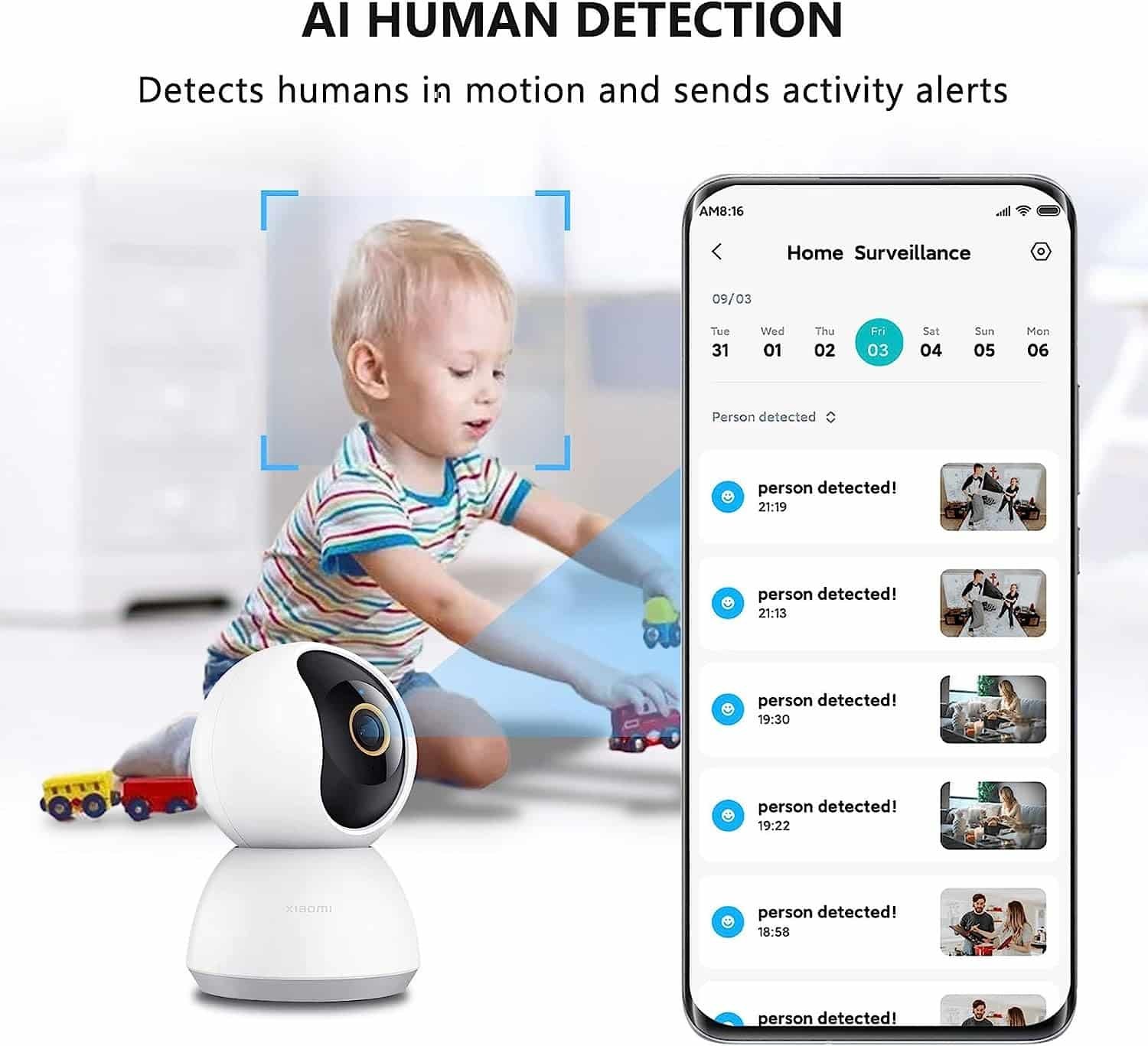 AI DETECCIÓN HUMANA y seguimiento inteligente La Xiaomi cámara de video vigilancia interior rastreará y registrará inteligentemente la trayectoria del movimiento, El monitor de bebé recibirá alertas en tiempo real cuando las personas ingresen al campo de visión de su cámara, filtre de manera efectiva las alarmas no válidas y brinde una mayor seguridad.