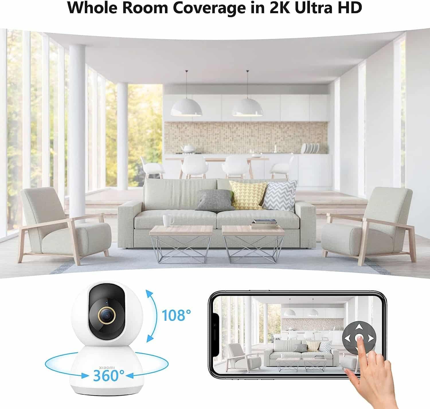 Ultra HD 2K 360° y visión nocturna La Xiaomi smart camera C300 cámara de vigilancia wifi está equipada con una lente ancha de resolución ULTRA HD 2K (2304 x 1296), apertura F1.4 * horizontal 360°, vertical 108, detalles de imagen ultra claros, lo que hace que la visualización experiencia más placentera. El LED infrarroja invisible baja de 940 nm, grabando video panorámico 1296P a todo color en tiempo real incluso de noche.