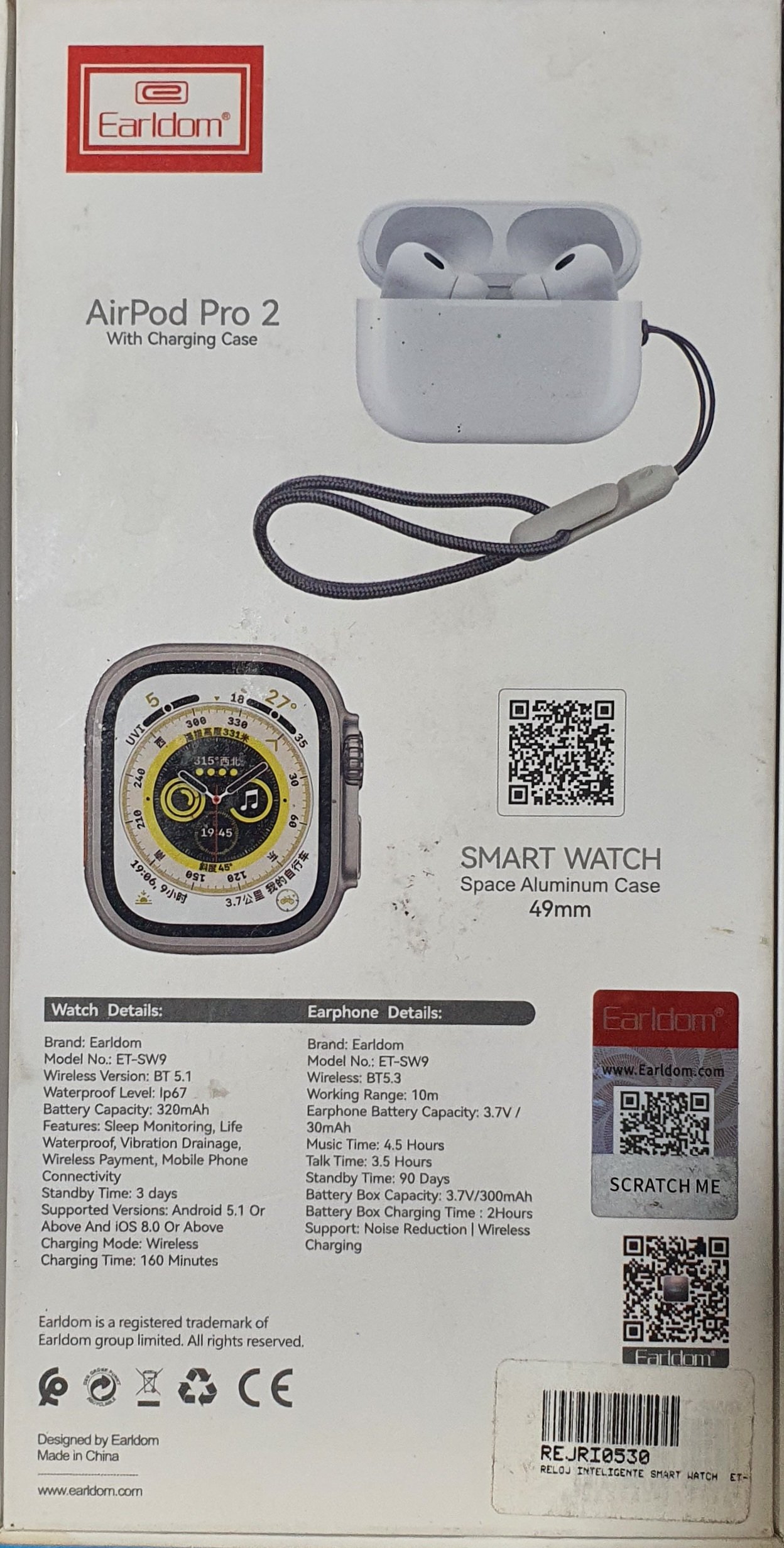 Disfruta de una experiencia completa con el combo AirPod Pro 2 y Smart Watch Earldom. Los AirPod Pro 2 ofrecen sonido nítido y comodidad superior, ideales para llamadas y música. El Smart Watch de 49mm con caja de aluminio espacial monitorea tu actividad física, notificaciones y más. Perfecto para quienes buscan funcionalidad y estilo en tecnología portátil.